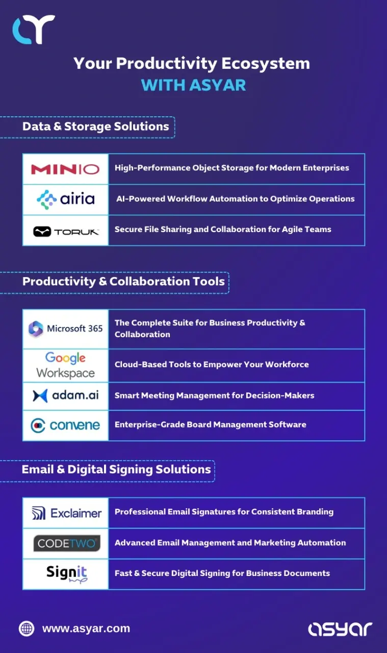 At Asyar, we’ve brought together globally recognized productivity brands—tailored to the Saudi market—to cover every layer of your operations: data and storage, productivity and collaboration, and email and digital signing solutions.